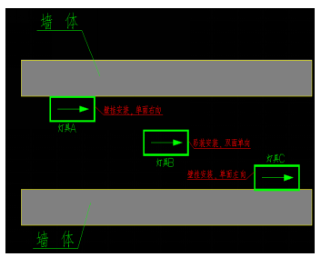 圖二燈具A、燈具C布置于墻體上選用壁掛安裝單面燈具;燈具B致于通道中間選用吊裝雙面單向燈具