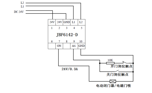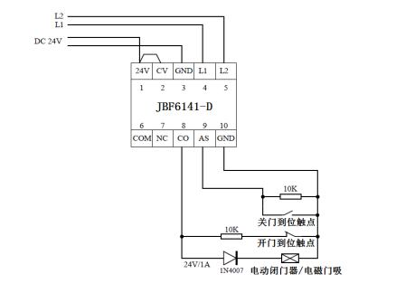 l AS(端子9)、GND(端子10)連接電動(dòng)閉門(mén)器上的關(guān)門(mén)到位信號(hào)(無(wú)源觸點(diǎn));