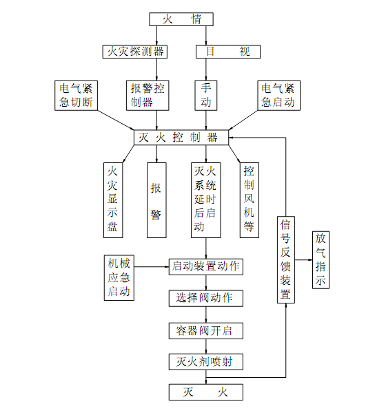5.3.1 系統(tǒng)的啟動方式為自動控制、手動控制和機(jī)械應(yīng)急手動控制三種。一般情況下應(yīng)使用手動控制,在保護(hù)區(qū)無人的情況下可以轉(zhuǎn)換為自動控制,當(dāng)自動控制和手動控制不能執(zhí)行時,應(yīng)采用機(jī)械應(yīng)急手動控制。