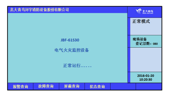 正常監(jiān)視狀態(tài)無任何聲響;“主電運行”燈閃亮,其余所有燈不亮;顯示當(dāng)前時間;顯示現(xiàn)場設(shè)備登記總數(shù);液晶屏在正常監(jiān)視狀態(tài)下運行5分鐘后,若無任何操作和報警,將進入屏幕保護狀態(tài)(黑屏)。按下任一鍵后, 可重新點亮屏幕。監(jiān)視狀態(tài)如圖6.1所示。