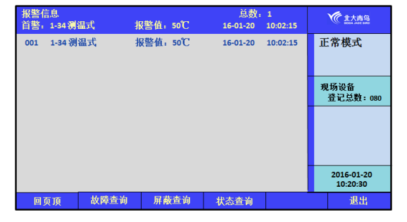 測溫式探測器的報警信息,首警將置于顯示屏最上方,顯示報警時的剩余電流值或溫度值,顯示報警地址、時間及報警總數(shù)。監(jiān)控設(shè)備收到報警信號發(fā)后,界面顯示信息如下圖6.2所示。