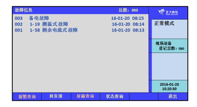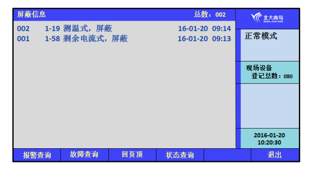 當(dāng)系統(tǒng)中有現(xiàn)場部件發(fā)生故障,不能正常工作時,為了不對整個系統(tǒng)造成影響,需要將故障部件屏蔽。在進行屏蔽操作后,該故障部件顯示被屏蔽,監(jiān)控設(shè)備復(fù)位后該部位不再報故障。當(dāng)系統(tǒng)內(nèi)存在部件被屏蔽時,面板屏蔽指示燈長亮,進入查詢菜單可以查詢到被屏蔽的部位號及屏蔽部位總數(shù)。