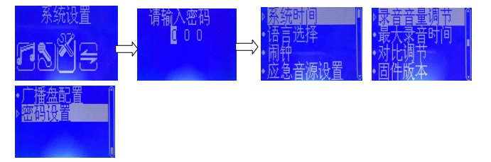大錄音時(shí)間”、“對(duì)比調(diào)節(jié)”、“固件版本”、“廣播盤配置”、“密碼設(shè)置”等幾個(gè)設(shè)置,如圖5-12所示