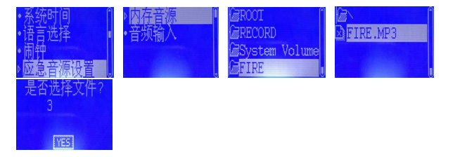 選擇“FIRE.MP3”音源,按“放音”鍵確認(rèn)選擇文件,再按“確認(rèn)”鍵,確認(rèn)保存選擇的文件,從當(dāng)前菜
