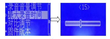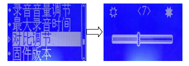 “確認(rèn)”鍵,再按“音量+”或“音量-”鍵設(shè)置對(duì)比度(最小為1,最大為15),按“菜單”鍵保存,并從