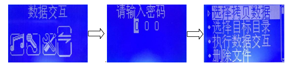 操作說明:在主菜單界面下,按“↑”、“↓”鍵選擇“數(shù)據(jù)交互”,然后按“確認(rèn)”鍵進(jìn)入輸入密碼