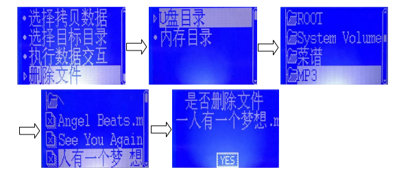 選擇刪除文件,按“確認(rèn)”鍵,按“↑”、“↓”鍵選擇“U盤目錄”或者“內(nèi)存目錄”,按“確認(rèn)”鍵,