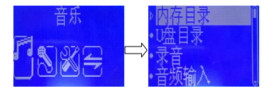 音樂菜單包括“內(nèi)存目錄”、“U盤目錄”、“錄音”、“音頻輸入”共4個(gè)子菜單,在播放USB音樂時(shí),不
