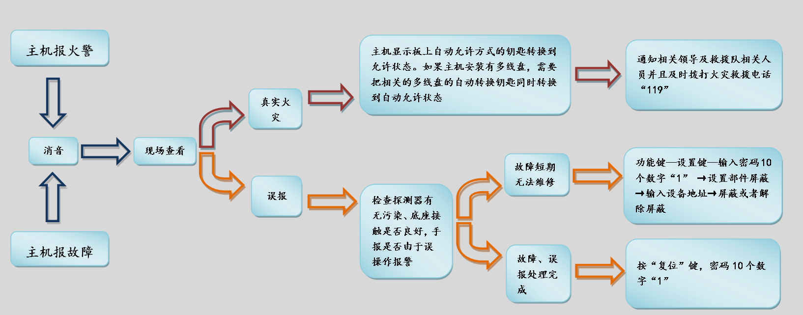 檢查探測(cè)器有無(wú)污染、底座接觸是否良好,手報(bào)是否由于誤操作報(bào)警。按照流程圖修復(fù)相關(guān)故障。