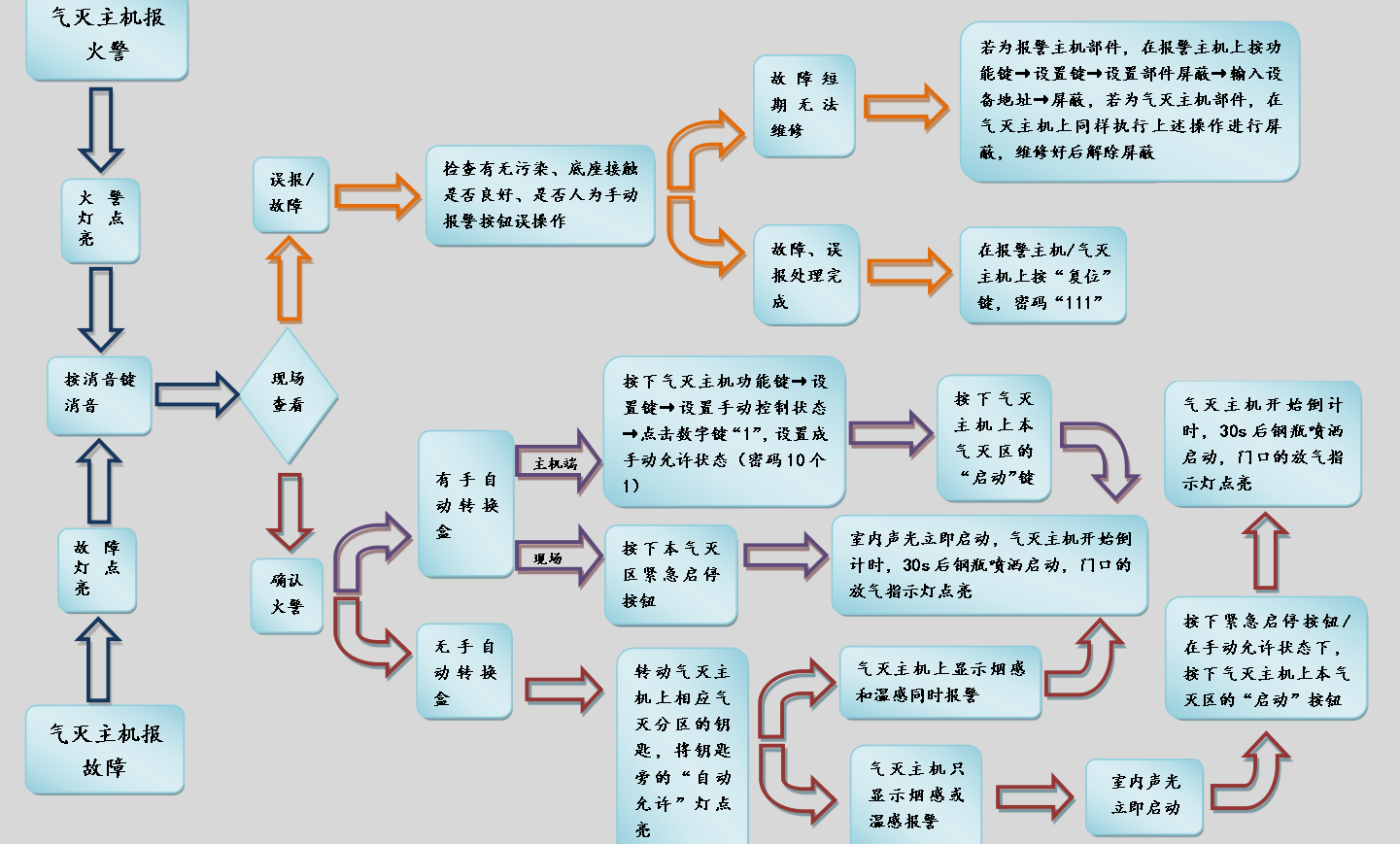 若主機(jī)無(wú)手自動(dòng)轉(zhuǎn)換盒,轉(zhuǎn)動(dòng)氣滅主機(jī)上相應(yīng)氣滅分區(qū)的鑰匙,將鑰匙旁的“自動(dòng)允許”燈點(diǎn)亮,按下緊急啟停按鈕/在手動(dòng)允許狀態(tài)下,按下氣滅主機(jī)上本氣滅區(qū)的“啟動(dòng)”按鈕,氣滅主機(jī)開(kāi)始倒計(jì)時(shí),30s后鋼瓶噴灑啟動(dòng),門口的放氣指示燈點(diǎn)亮